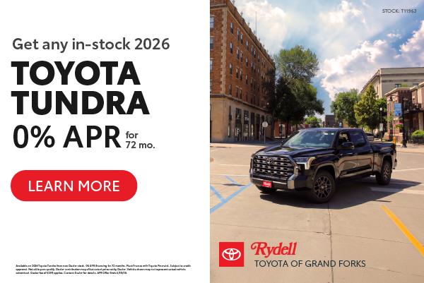 Available on 2026 Toyota Tundra from new Dealer stock. 0% APR financing for 72 months. Must finance with Toyota Financial. Subject to credit approval. Not all buyers qualify. Dealer contribution may affect actual price set by Dealer. Vehicle shown may not represent actual vehicle advertised. Dealer fee of $299 applies. Contact Dealer for details. APR Offer Ends 4/30/26.