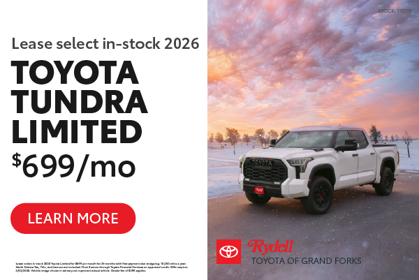 Lease select in-stock 2026 Toyota Limited for $699 per month for 36 months with first payment due at signing. 10,000 miles a year. North Dakota Tax, Title, and License are included. Must finance through Toyota Financial Services on approved credit. Offer expires 3/02/2026. Vehicle image shown in ad may not represent actual vehicle. Dealer fee of $299 applies.